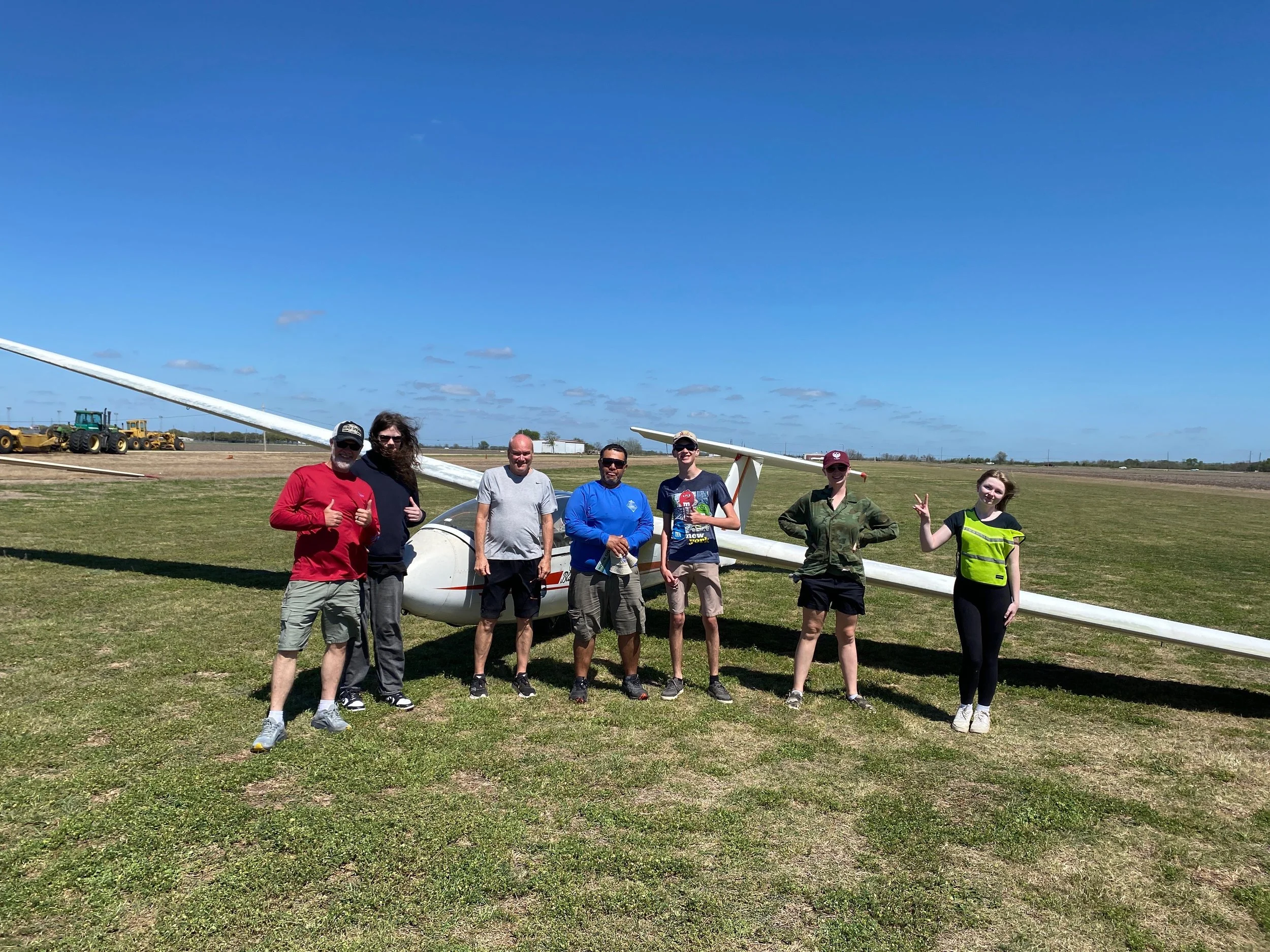 Cade (3rd from right) shown with the entire team did 3 flights with very nice soft and precise landings. His first flight was 40 minutes long earning him the SSA A and B Badges. Awesome Cade.