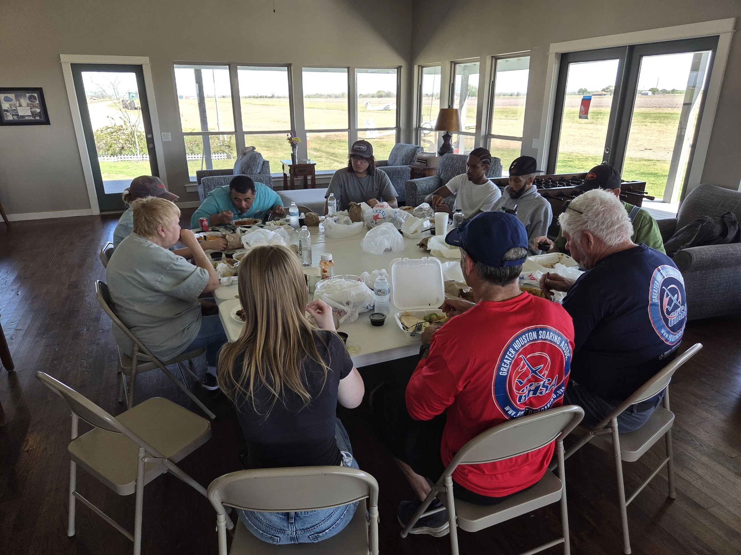 Video review in briefing room with Jay. Gary and Deb installing new link on tow rope. Nice new drainage trench on the Southwest side of the field. Last day with lunch completing 51 flights this week. Thanks to all the volunteers and Beth making it happen.